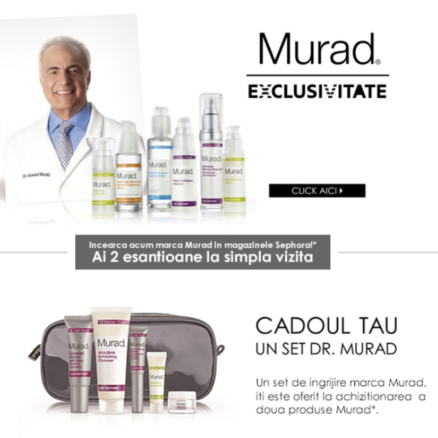 Daca aveti drum pe la Sephora veti primi doua esantioane de produse Murad sau un set de ingrijire Dr. Murad la achizitionarea a doua produse de la brandul mentionat.