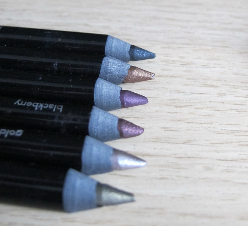 Evident, cel mai folosit a fost negrul. Particulele argintii nu sunt foarte vizibile pe pleoapa. Bronze am folosit cand am vrut un liner mai putin vizibil insa de efect, de obicei combinat cu farduri in nuante asemanatoare. Plumful imi place cel mai putin pentru ca nu se aplica uniform iar movul nu este chiar ce ma asteptam eu. Blackberry este ultimul achizitionat impreuna cu Golden fawn. Daca primul din cele doua imi place la nebunie si l-as purta incontinuu, despre al doilea nu pot spune ca am profitat prea mult. L-am mai aplicat pe linia apei insa nu a fost prea de efect. Shimmer khaki este primul cumparat, inca de pe vremea cand eram fascinata de nuantele de kaki. Mi-a mai trecut de atunci.