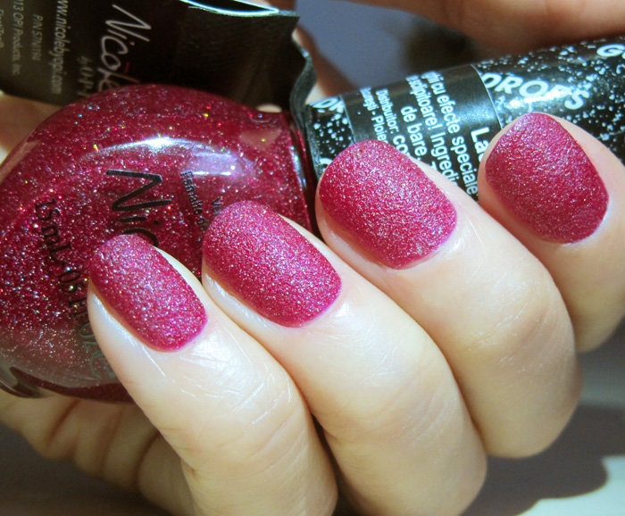 My Cherry Amour de la Nicole by OPI este o nuanta de rosu-movuliu-visiniu cu particule multicolore pe care, evident, este aproape imposibil sa le prinzi in poze. Mai ales in perioada aceasta cand soarele acum este 10 minute dupa care nu mai e toata ziua. Desi se numeste “cherry” ma duce cu gandul mai degraba la o visina foarte coapta.