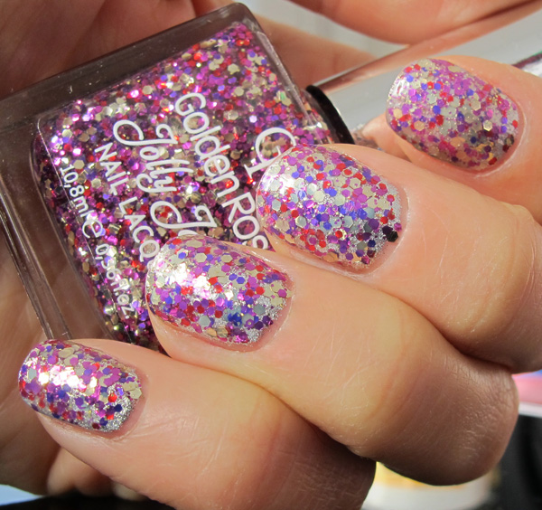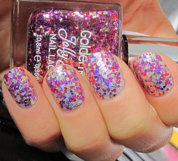 Cea de-a doua oja de astazi face parte din colectia Jolly Jewels (OJJW120), una dintre cele mai “vanate” colectii Golden Rose, si este un glitter nu foarte marunt. Recunosc ca mi-a fost teama de aceasta oja si m-am uitat de foarte multe ori lung la ea. Nu stiam cu ce sa o combin si mi se parea greu de aplicat. Pana la urma am ales un argintiu Color Club destul de opac din primul strat peste care am aplicat-o in doua straturi si am acoperit-o cu un top coat pentru uscare rapida. S-a vazut frumos. Mie mi-a placut, era ceva inedit pentru mine care nu-s cea mai buna prietena cu glitterele. Sotul meu a detestat-o si tare s-a bucurat cand mi s-au cojit toate cele 4 straturi din cauza de unghii pilite si alunecoase, cum spuneam mai sus.