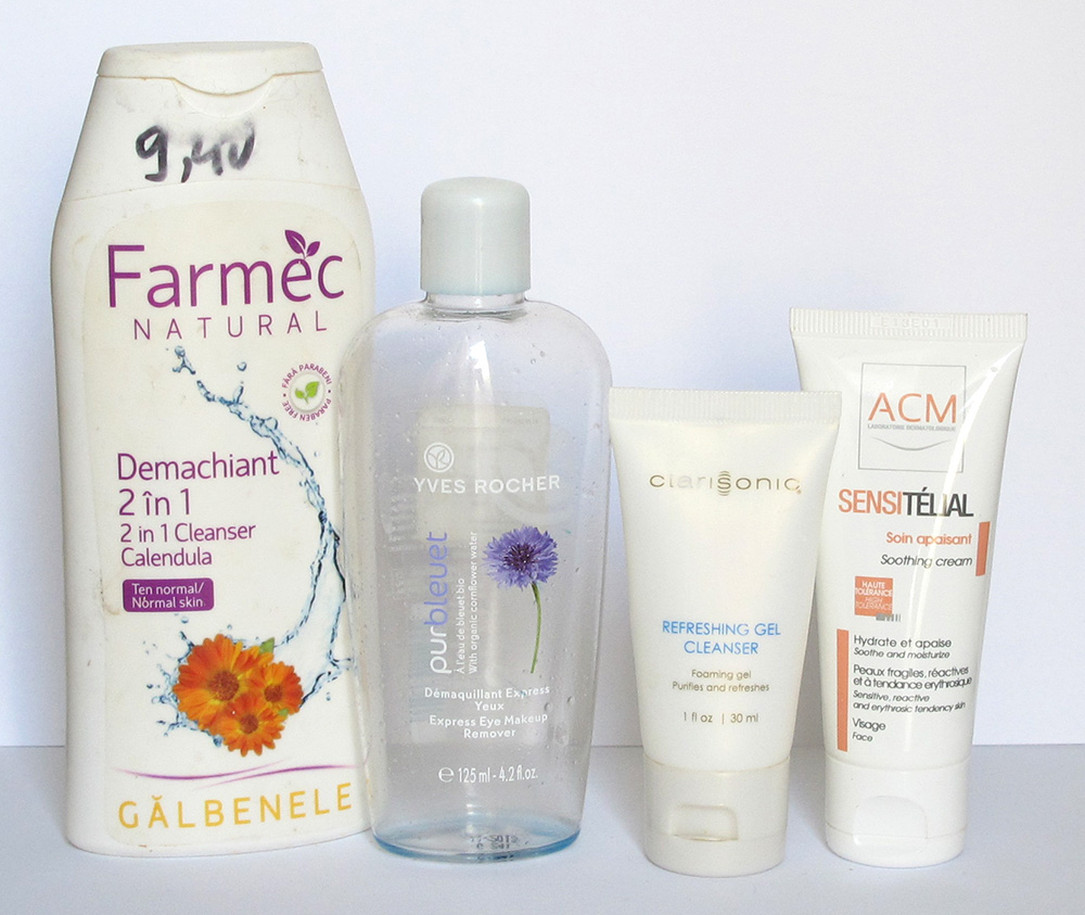 Demachiantul Farmec 2 in 1 cu galbenele a fost cumparat in deplasare de la un butic de cartier. Mi-era dor de un astfel de produs si mi-am facut damblaua. Am fost multumita de el. Bifazicul Yves Rocher a stat mult timp prin baie (in exemplare diferite). E unul dintre preferatele mele. Gelul spumant Clarisonic a venit impreuna cu jucaria de rigoare. Ne-am inteles bine. Nu m-am interesat inca daca il pot gasi si de cumparat. Sensitelial de la ACM va reveni curand in baia mea. Zilele astea am stors ultimele picaturi si au facut minuni cu niste zgaibite de pe fata. Daca nu ma potolesc cu zgarmatul de cosuri e bine sa-l am in baie. Am scris despre el aici.