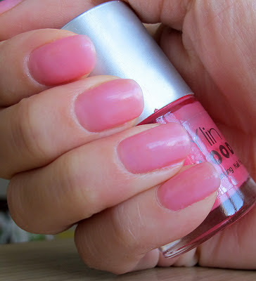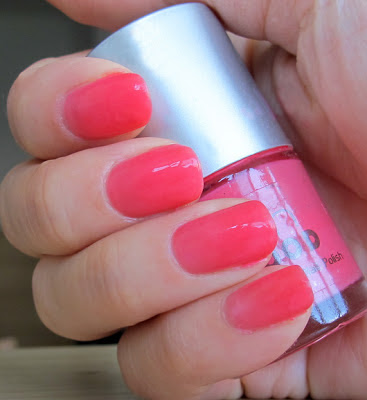 Este o oja pe baza de apa si este prima de acest tip din colectia mea. Spun asta pentru ca in loc sa se usuce se… evapora! Asa ca m-a lovit ideea geniala: sa folosesc uscatorul de par. Zis si facut si a functionat! A fost nevoie de trei straturi pentru o acoperire perfecta.