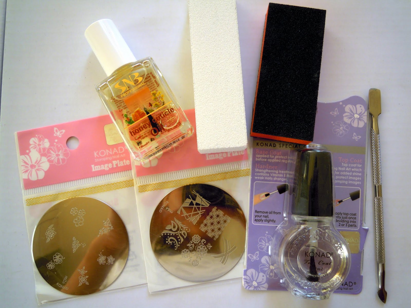 Aici avem Konad, dupa cum puteti observa. Un ulei de cuticule cu miere care-mi place foarte mult dupa prima folosire, pur si simplu dispare in cuticula, o scula de impins cuticulele si doua pile.
